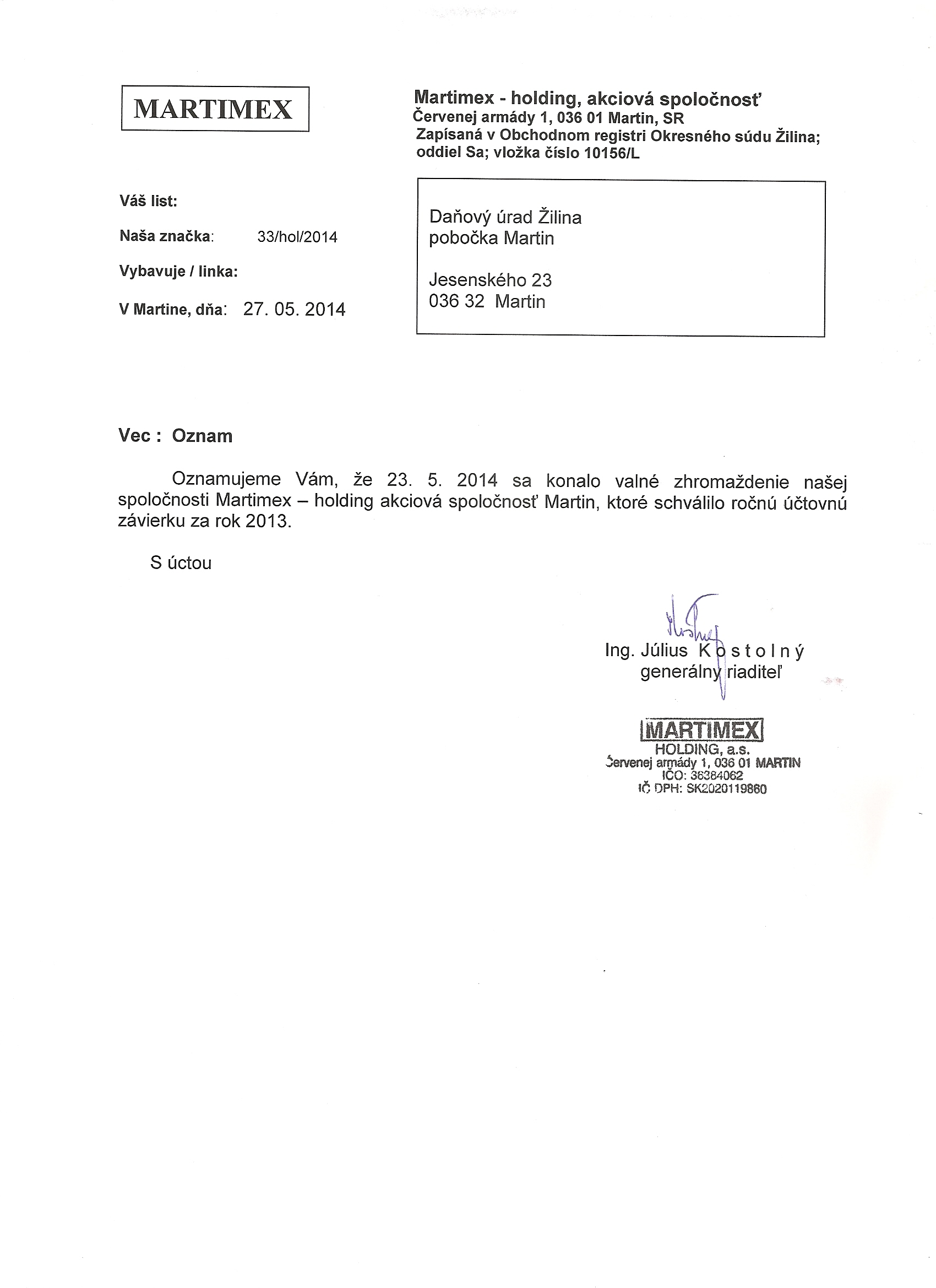 Oznámenie o schválení účtovnej závierky