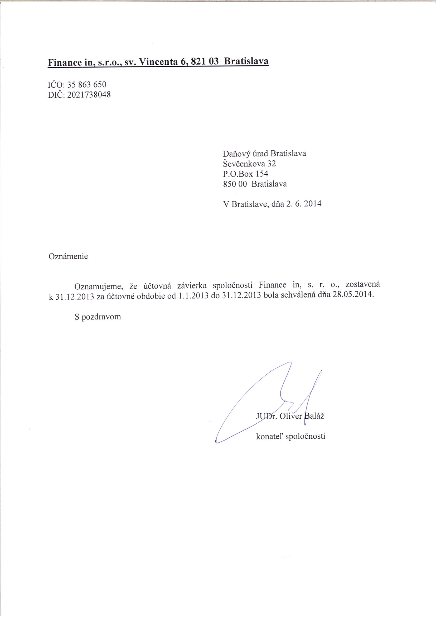 Oznámenie o schválení účtovnej závierky