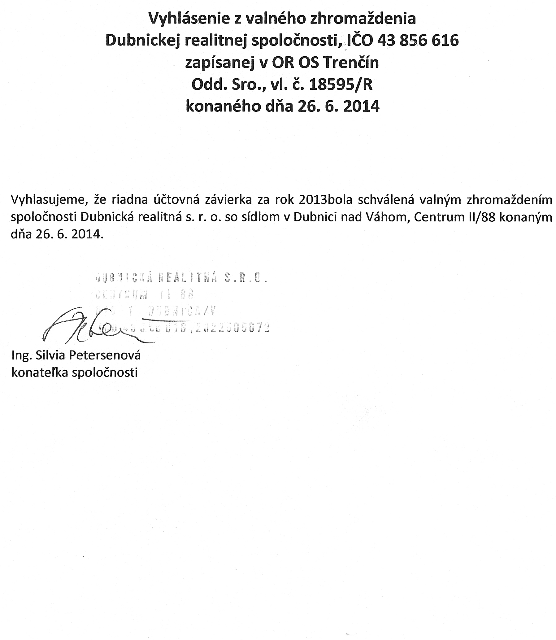 Oznámenie o schválení účtovnej závierky