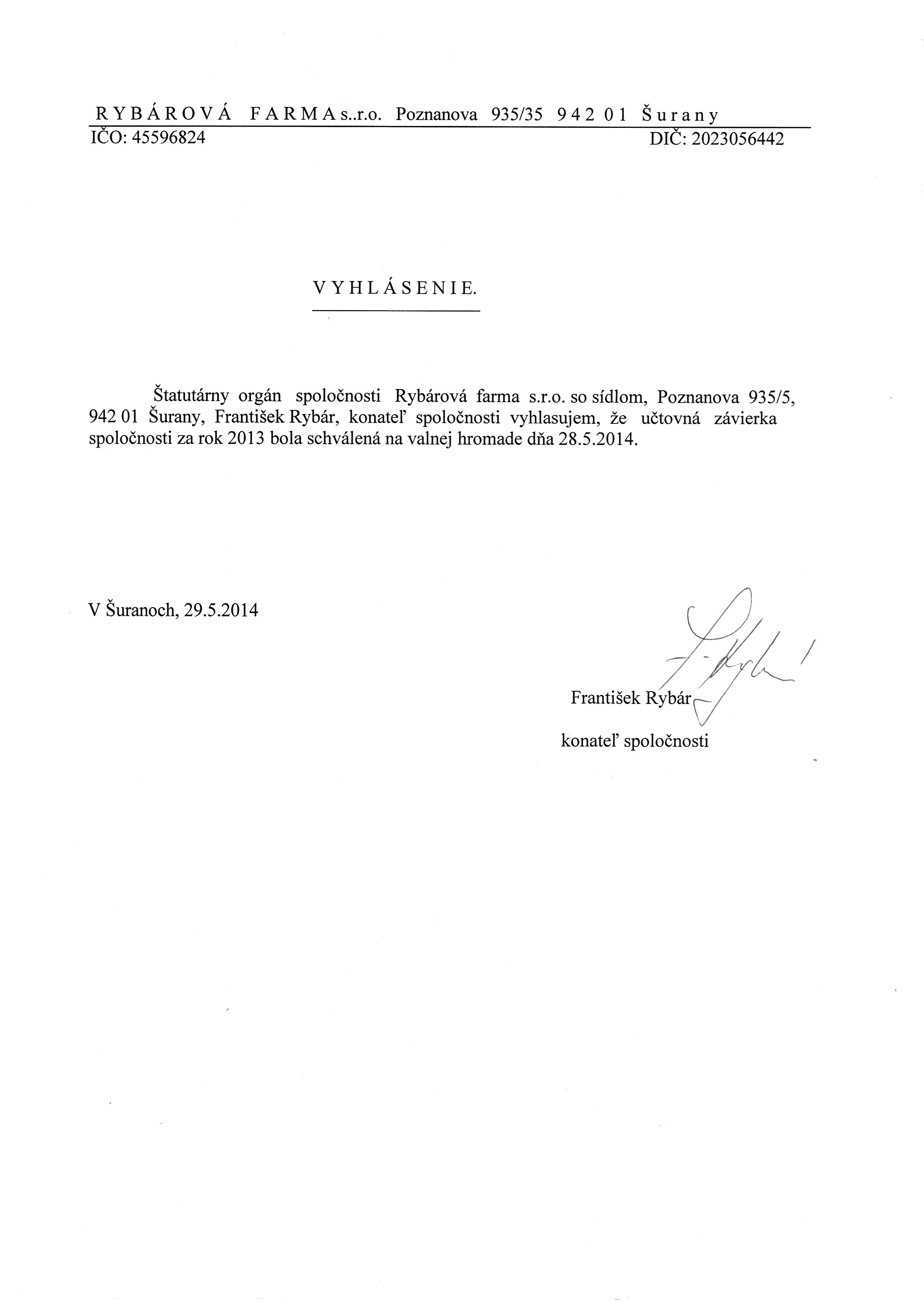 Oznámenie o schválení účtovnej závierky