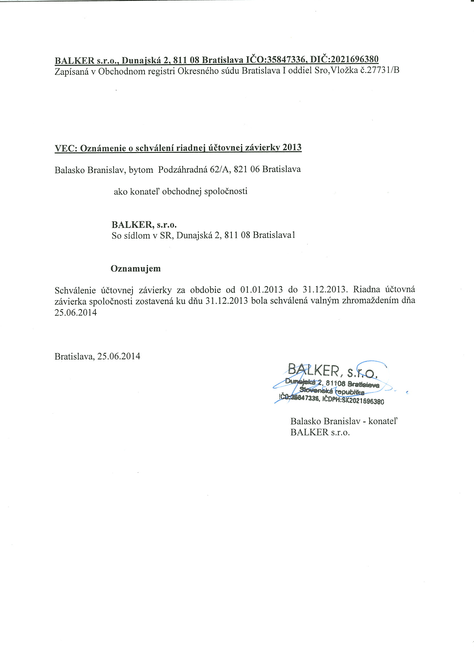 Oznámenie o schválení účtovnej závierky