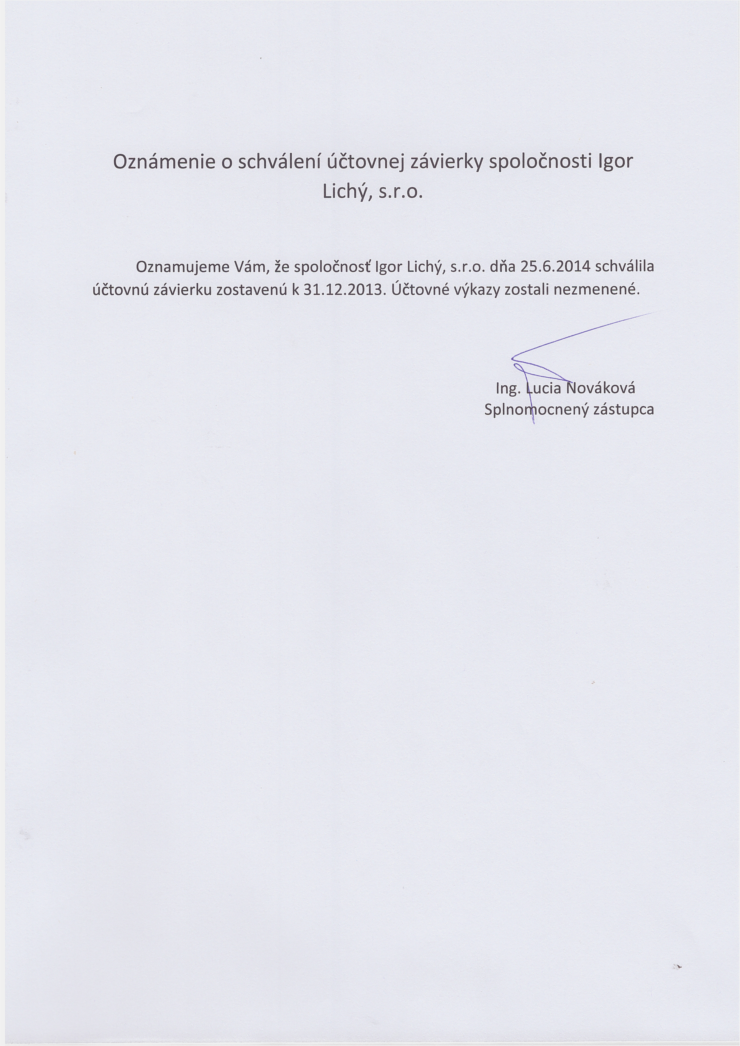 Oznámenie o schválení účtovnej závierky