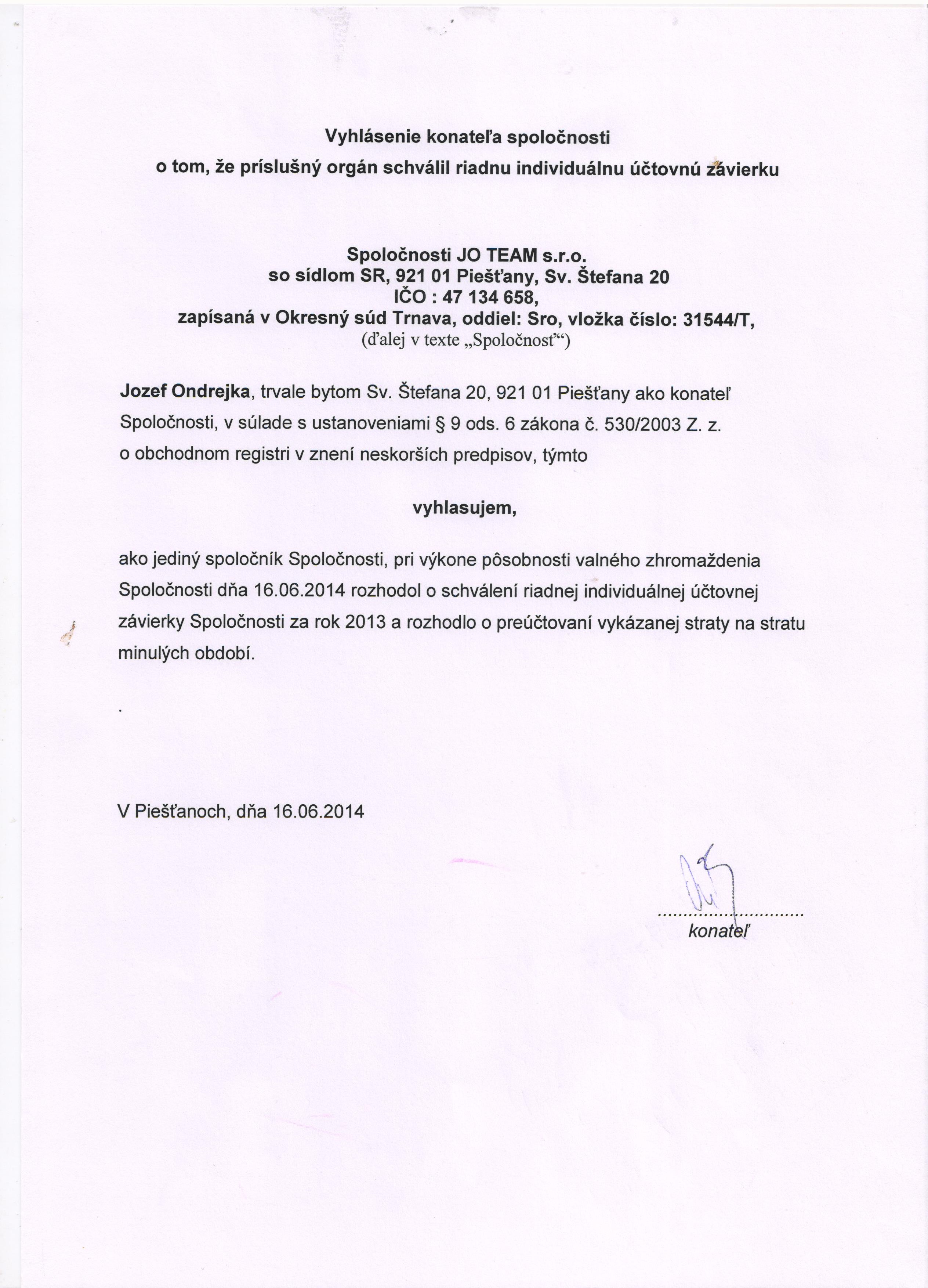 Oznámenie o schválení účtovnej závierky