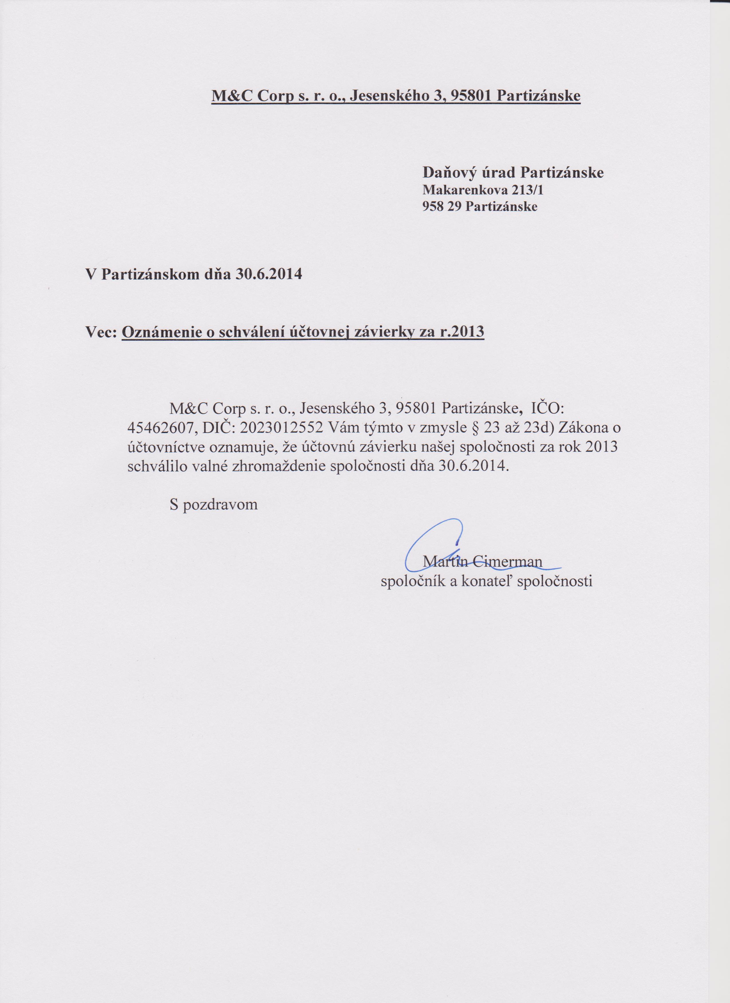 Oznámenie o schválení účtovnej závierky