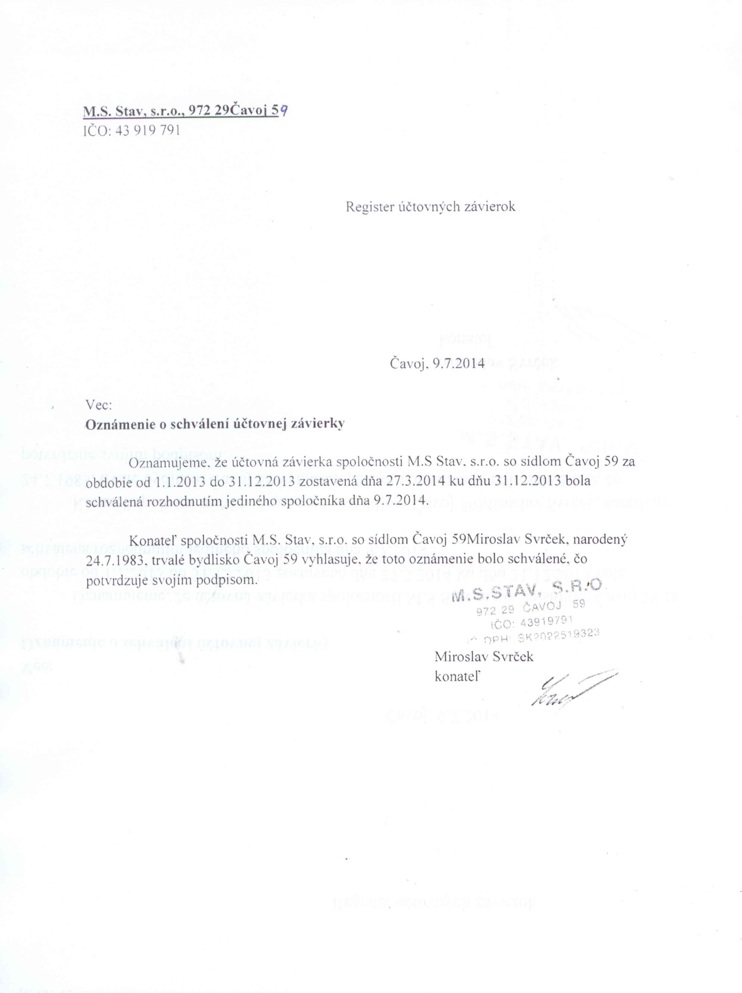 Oznámenie o schválení účtovnej závierky