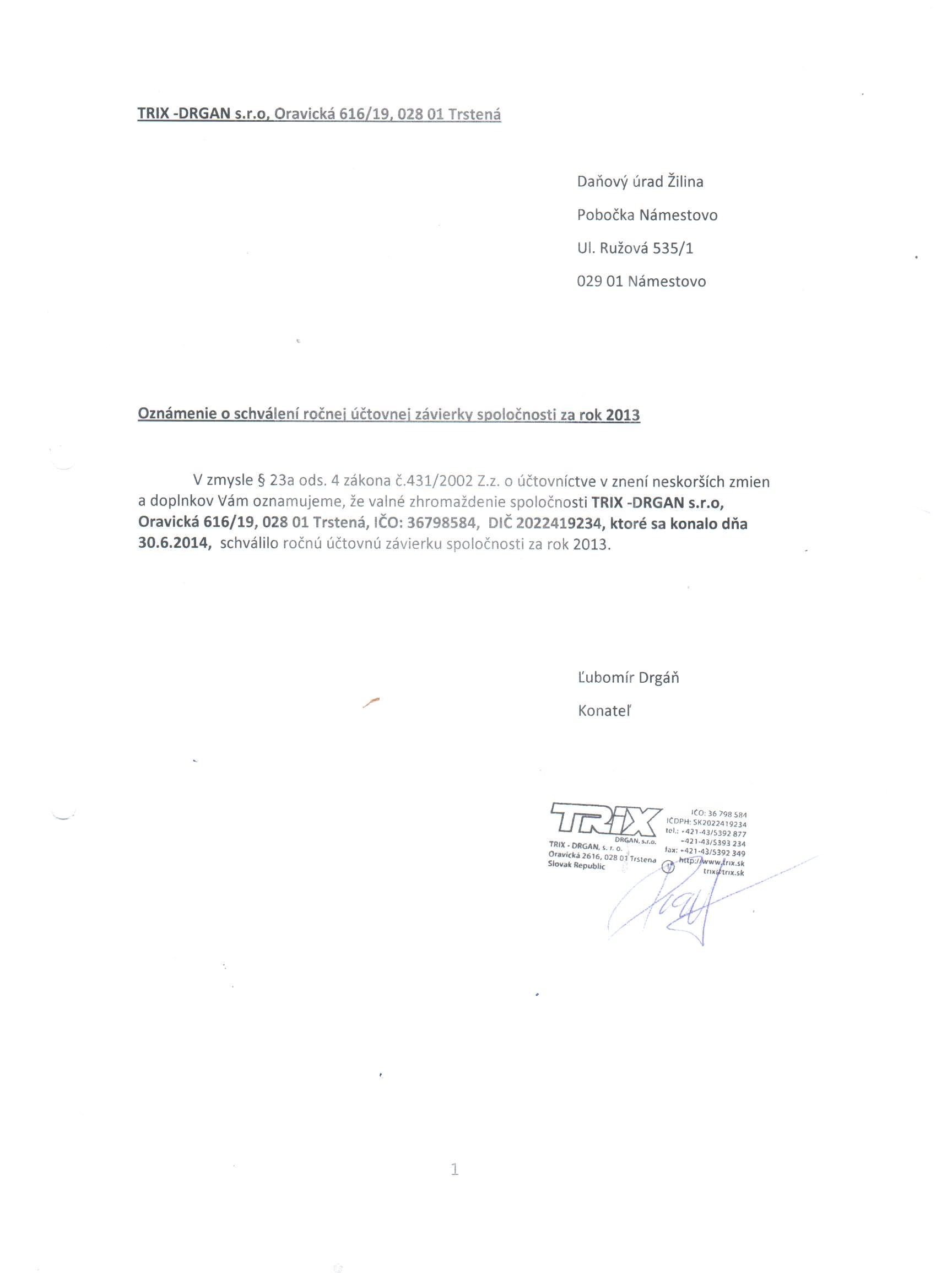 Oznámenie o schválení účtovnej závierky