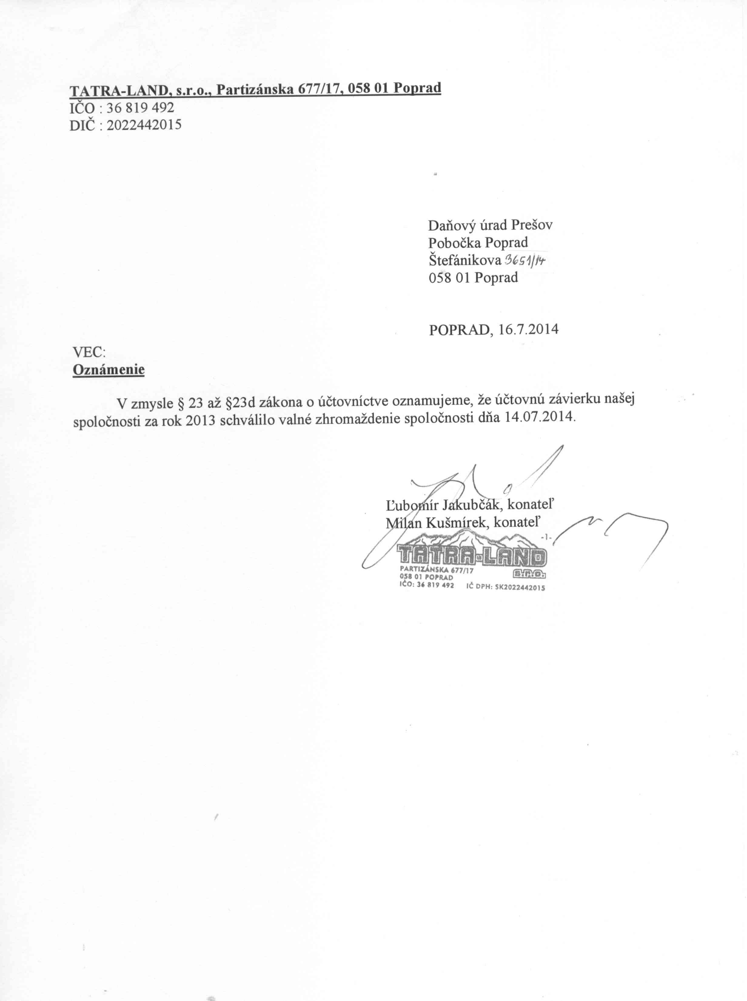 Oznámenie o schválení účtovnej závierky