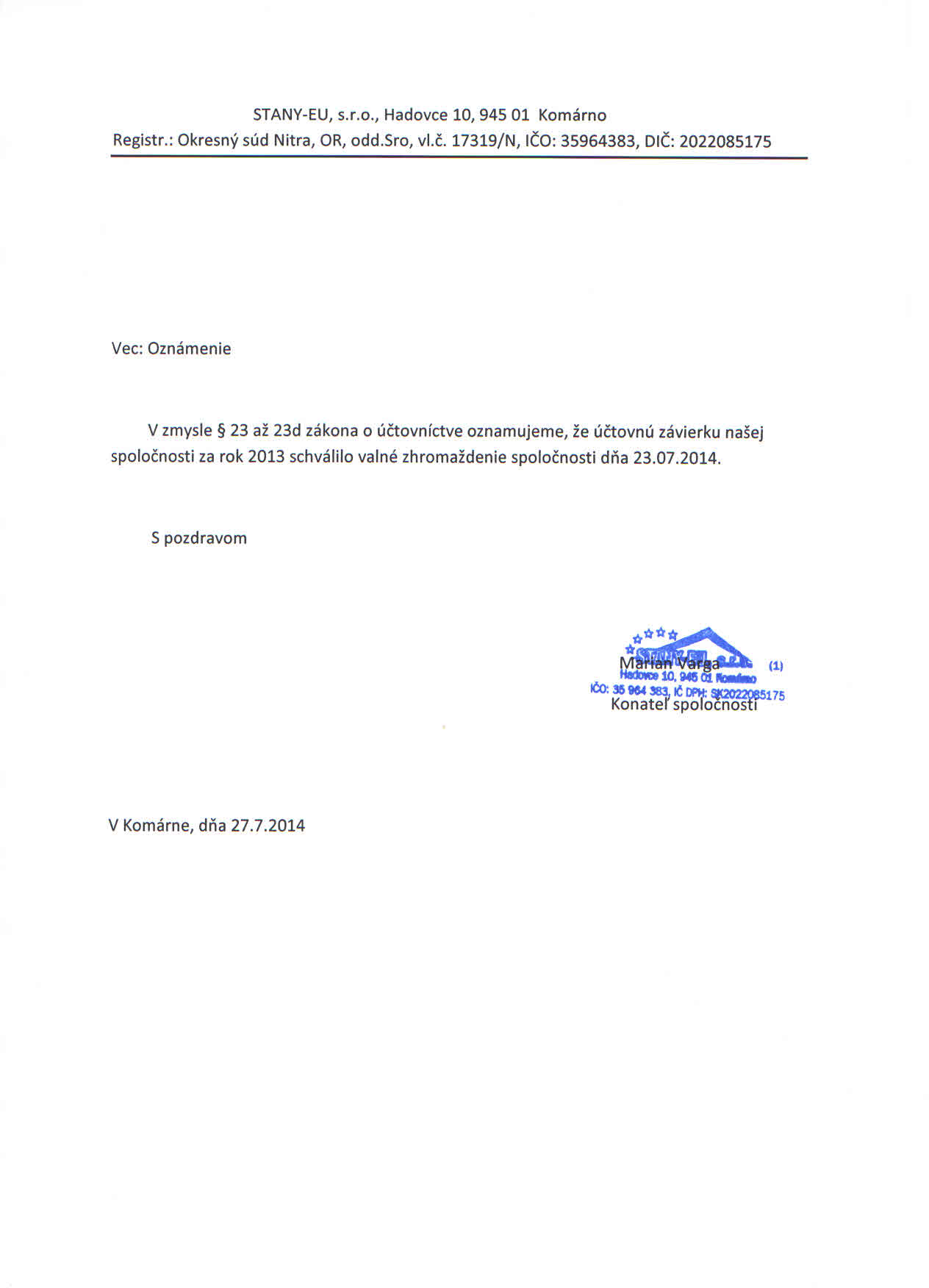 Oznámenie o schválení účtovnej závierky