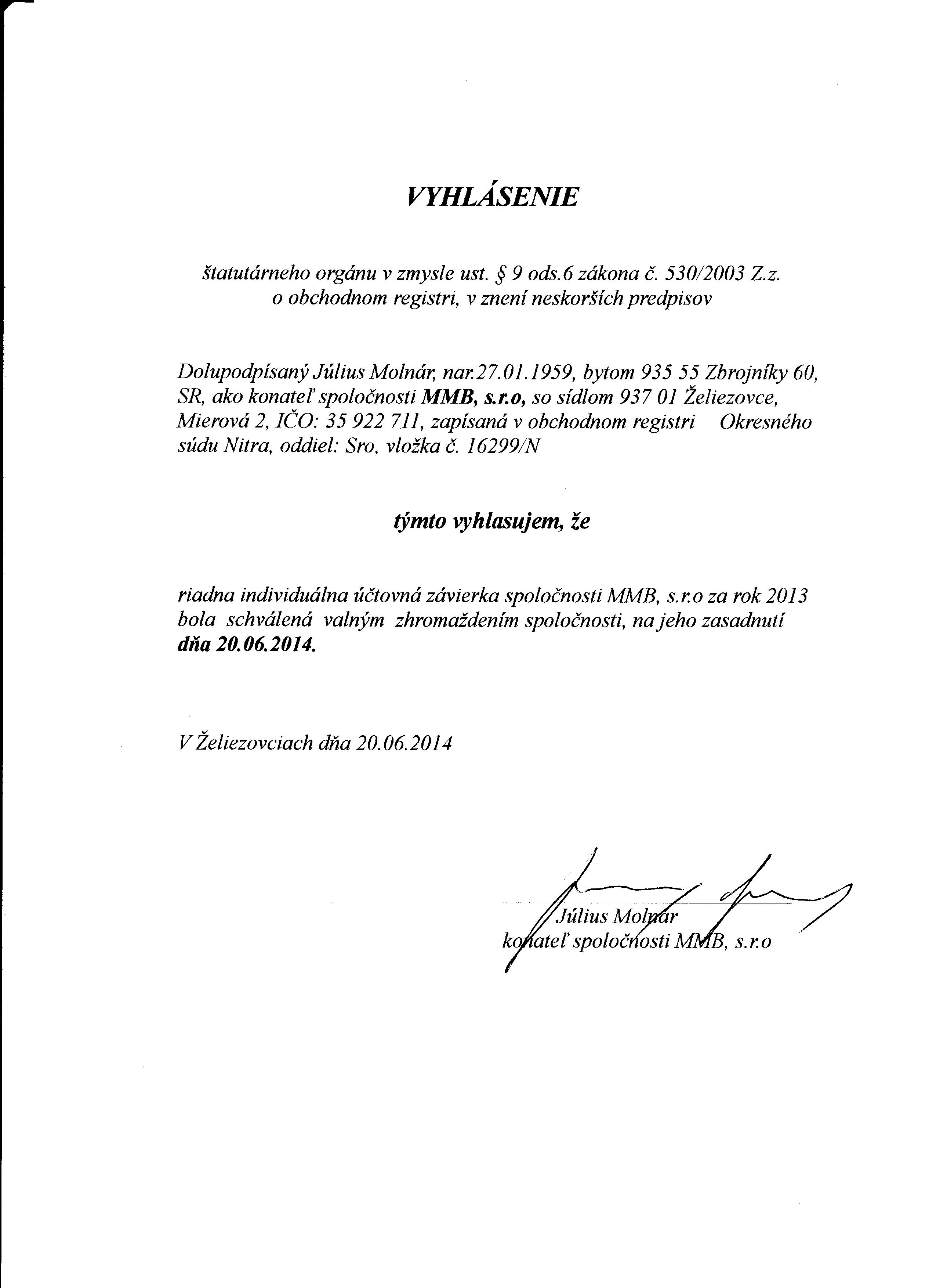 Oznámenie o schválení účtovnej závierky