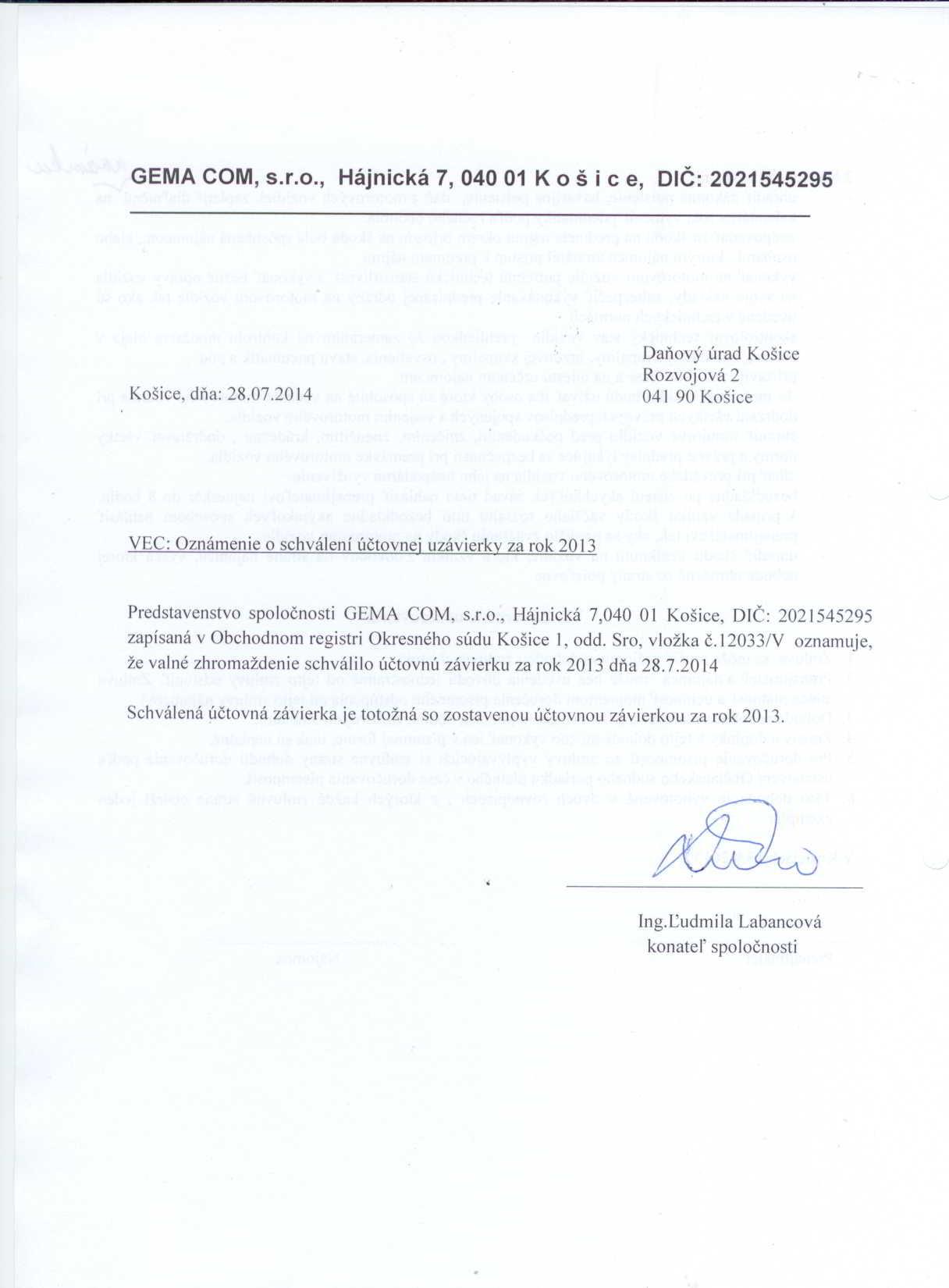 Oznámenie o schválení účtovnej závierky