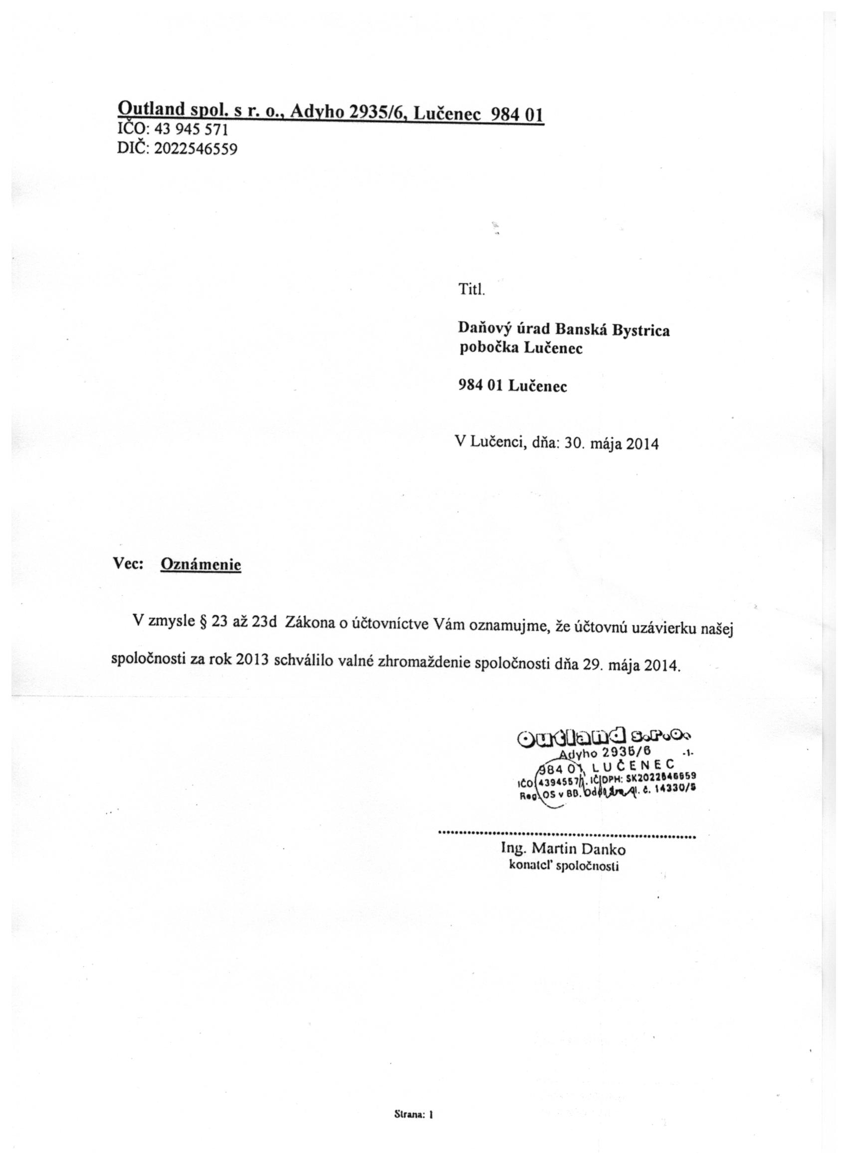 Oznámenie o schválení účtovnej závierky