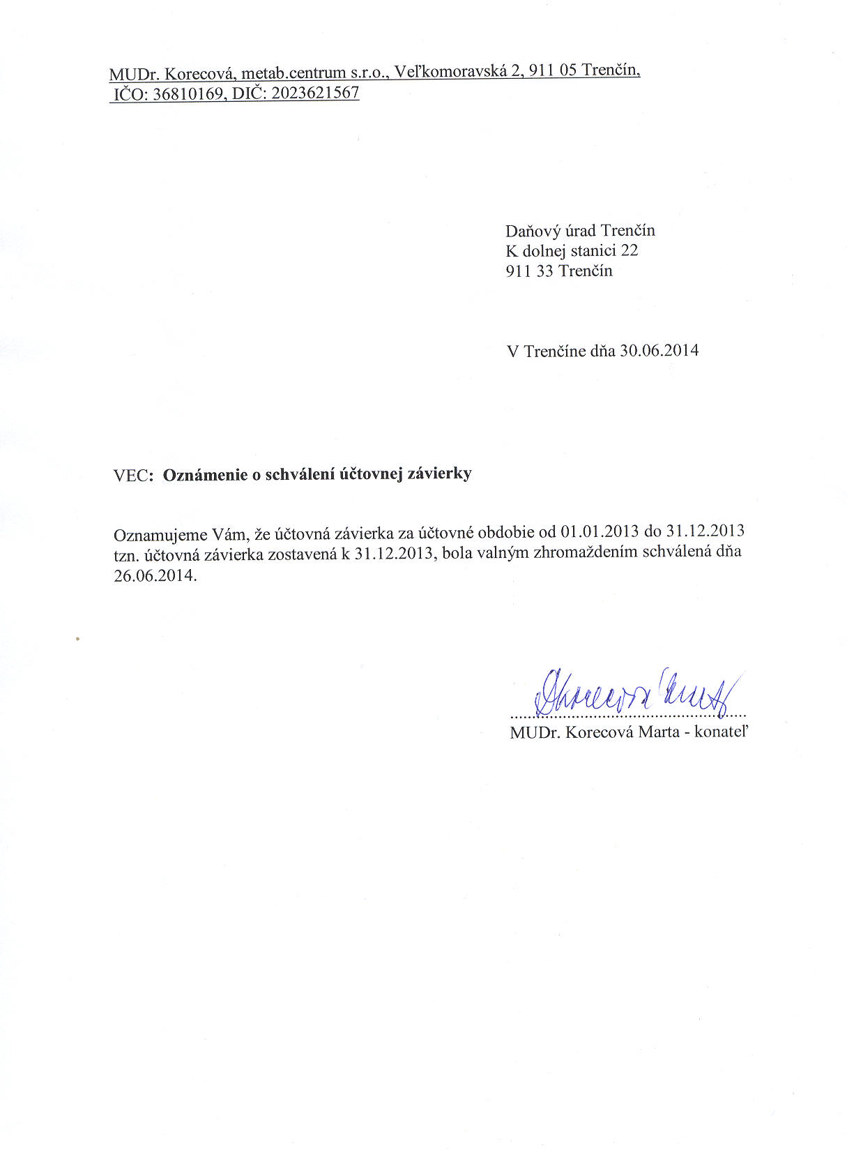 Oznámenie o schválení účtovnej závierky
