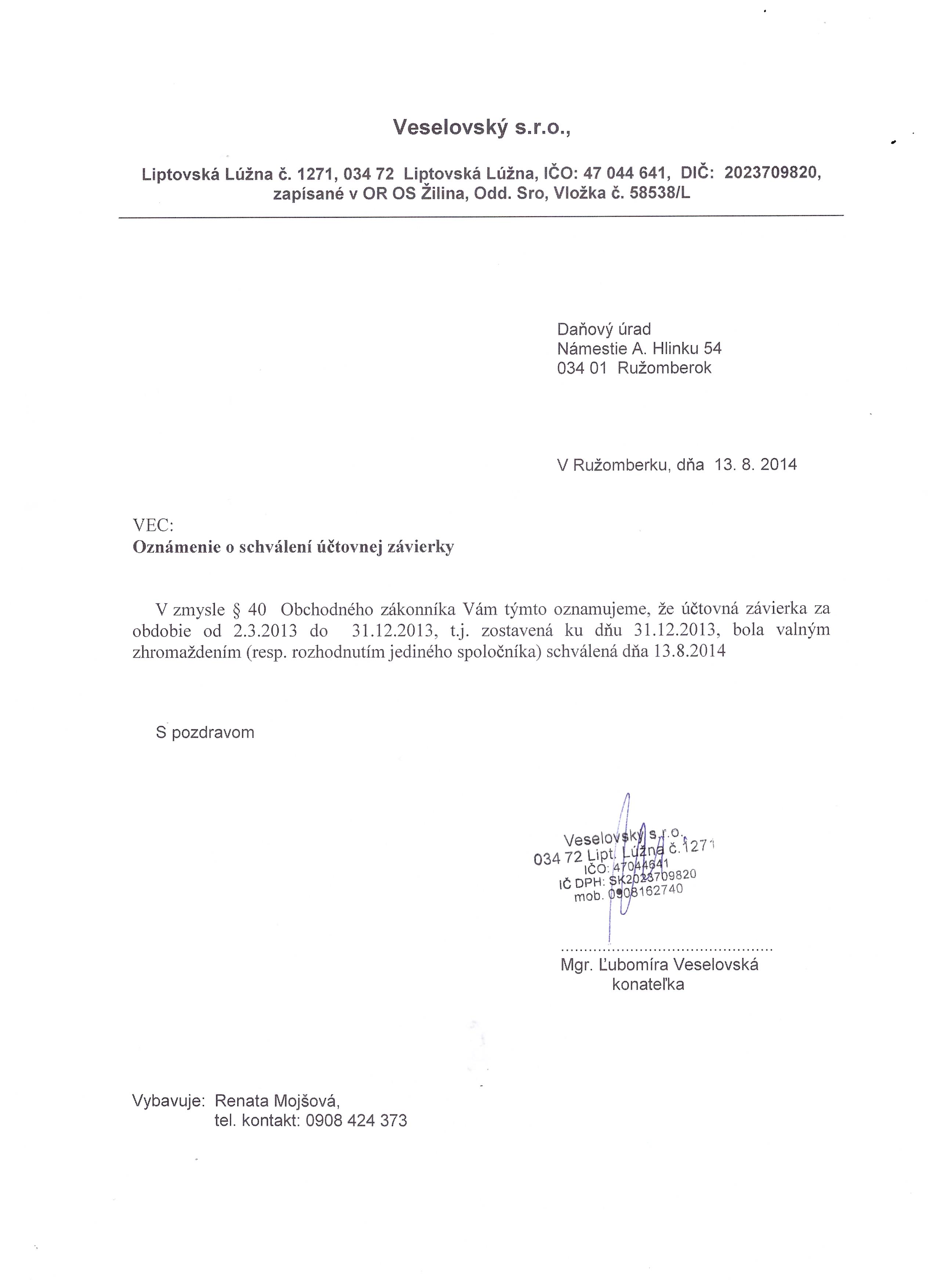 Oznámenie o schválení účtovnej závierky