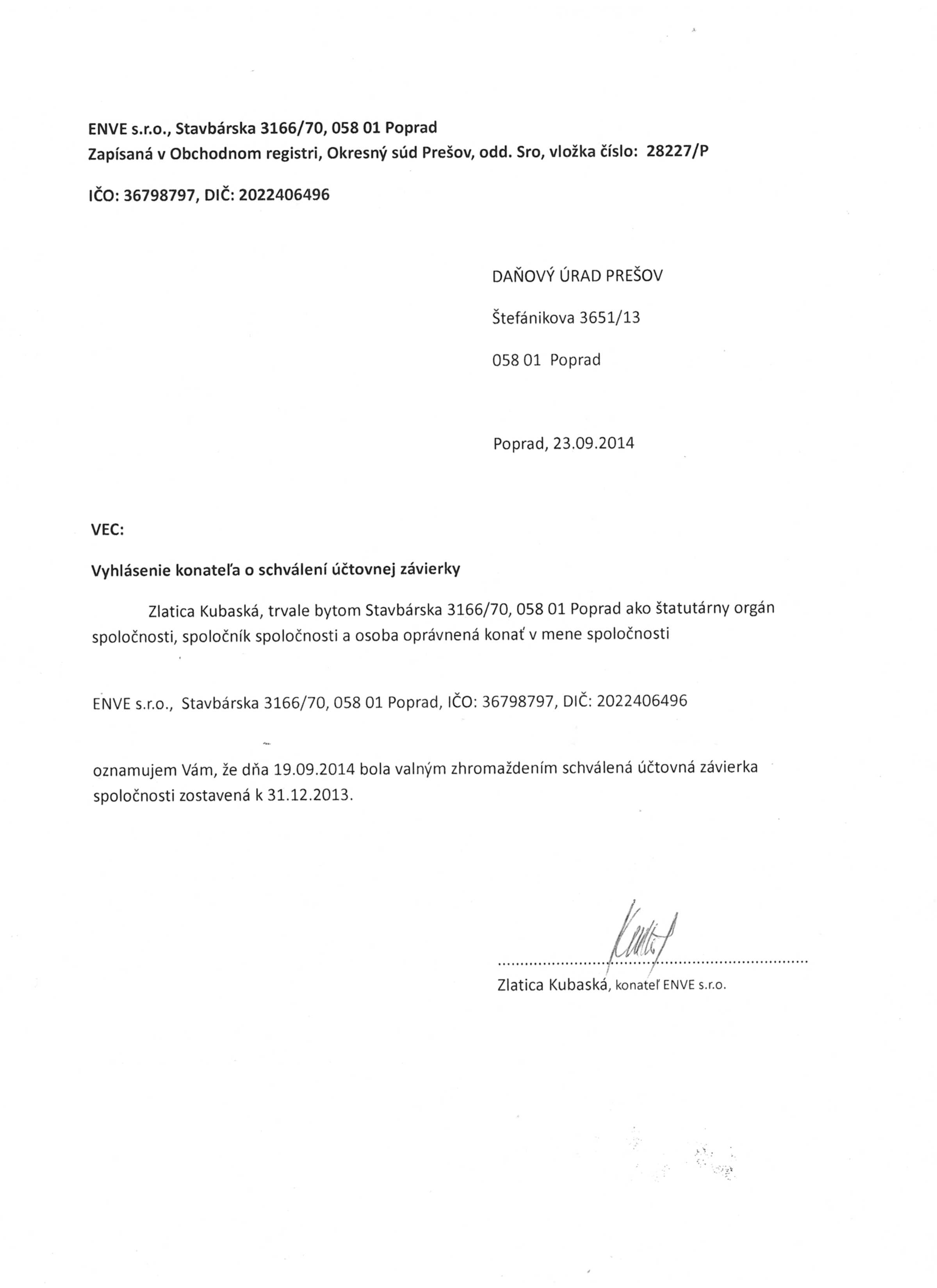 Oznámenie o schválení účtovnej závierky