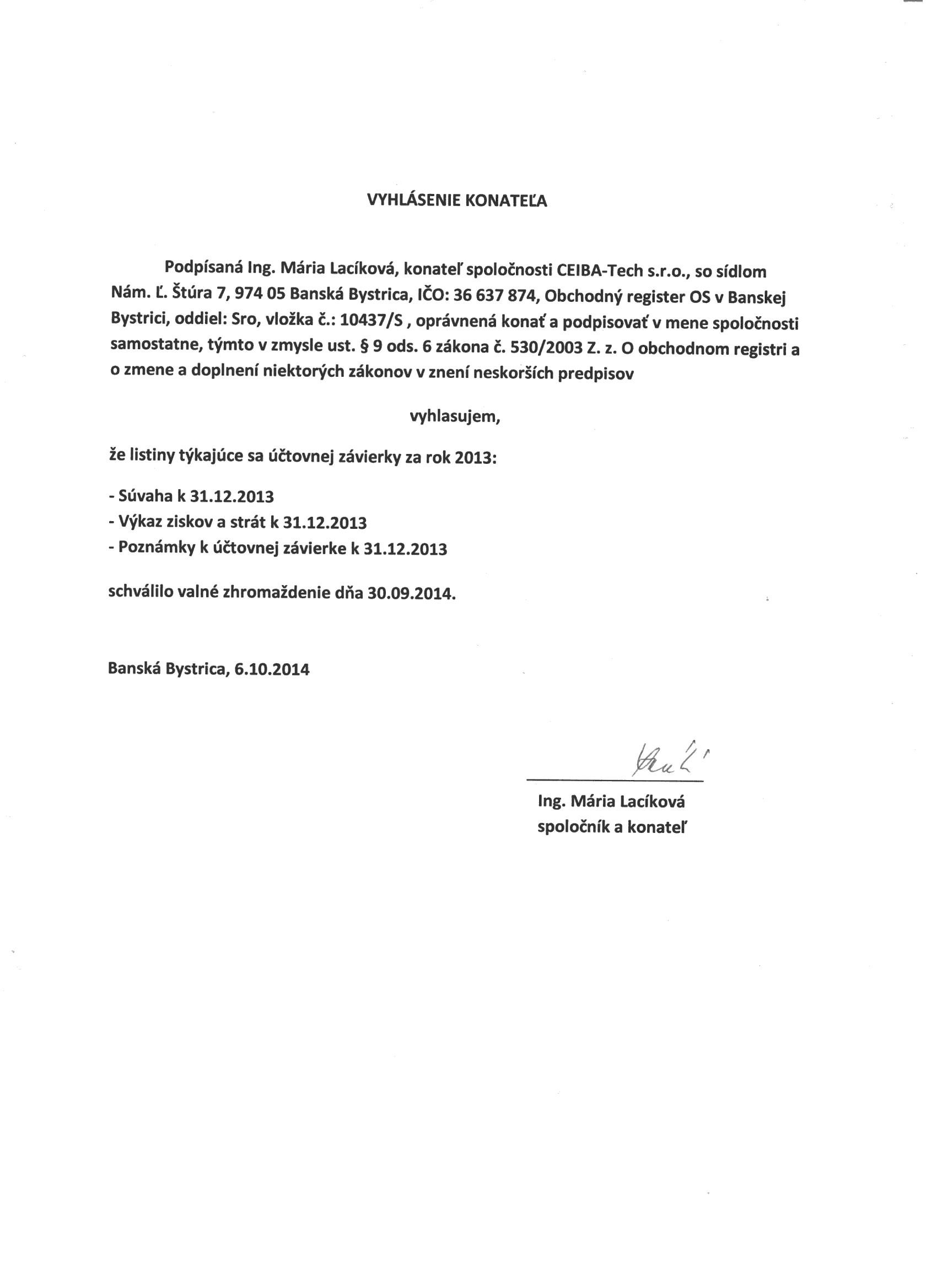 Oznámenie o schválení účtovnej závierky