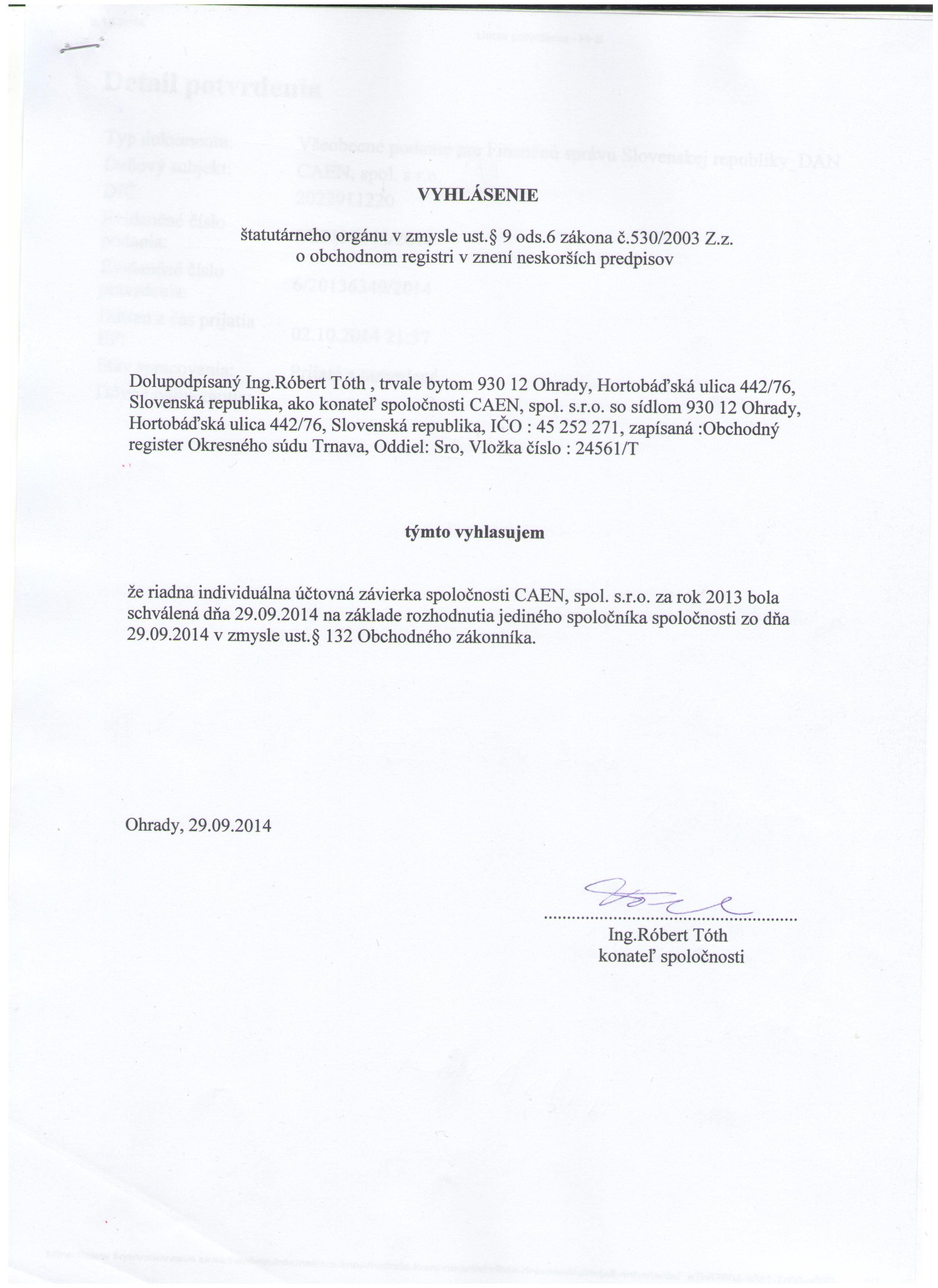 Oznámenie o schválení účtovnej závierky