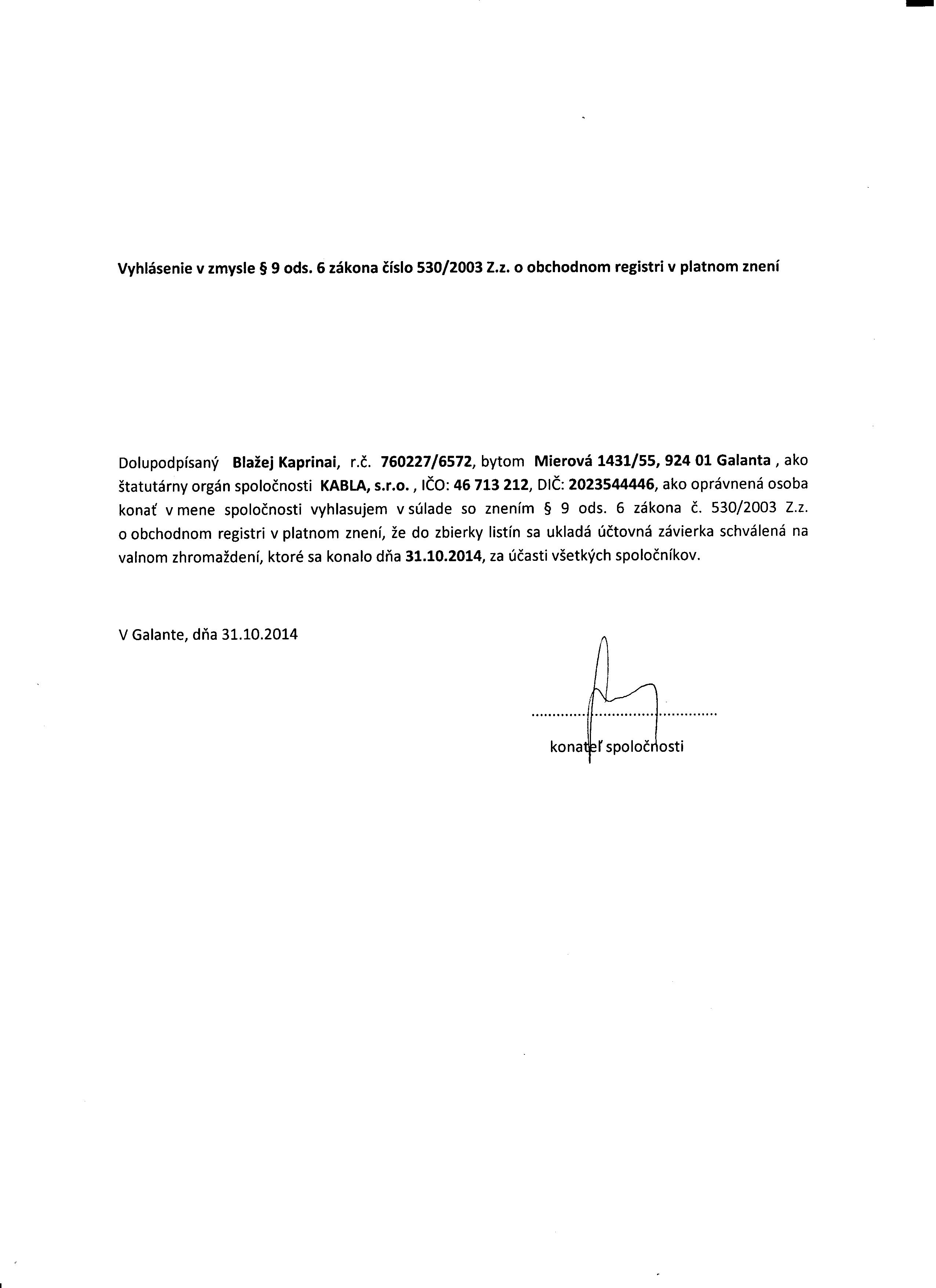 Oznámenie o schválení účtovnej závierky