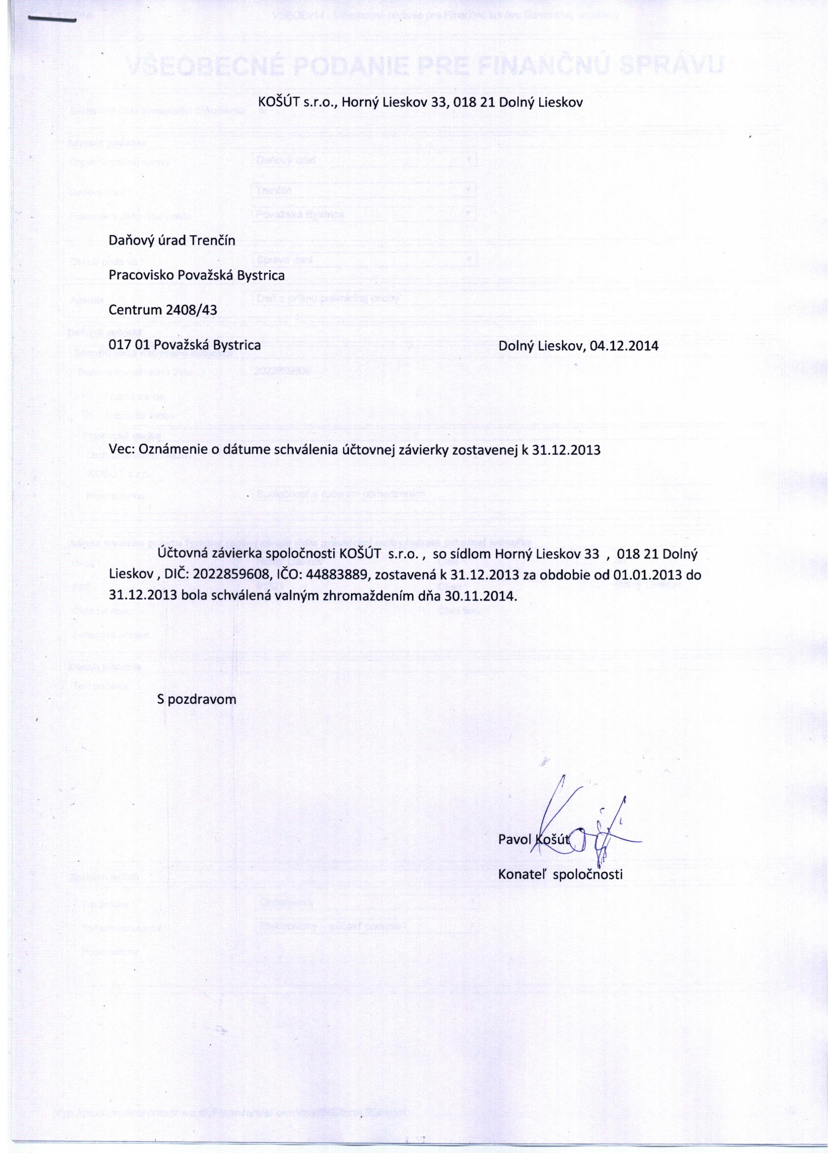Oznámenie o schválení účtovnej závierky