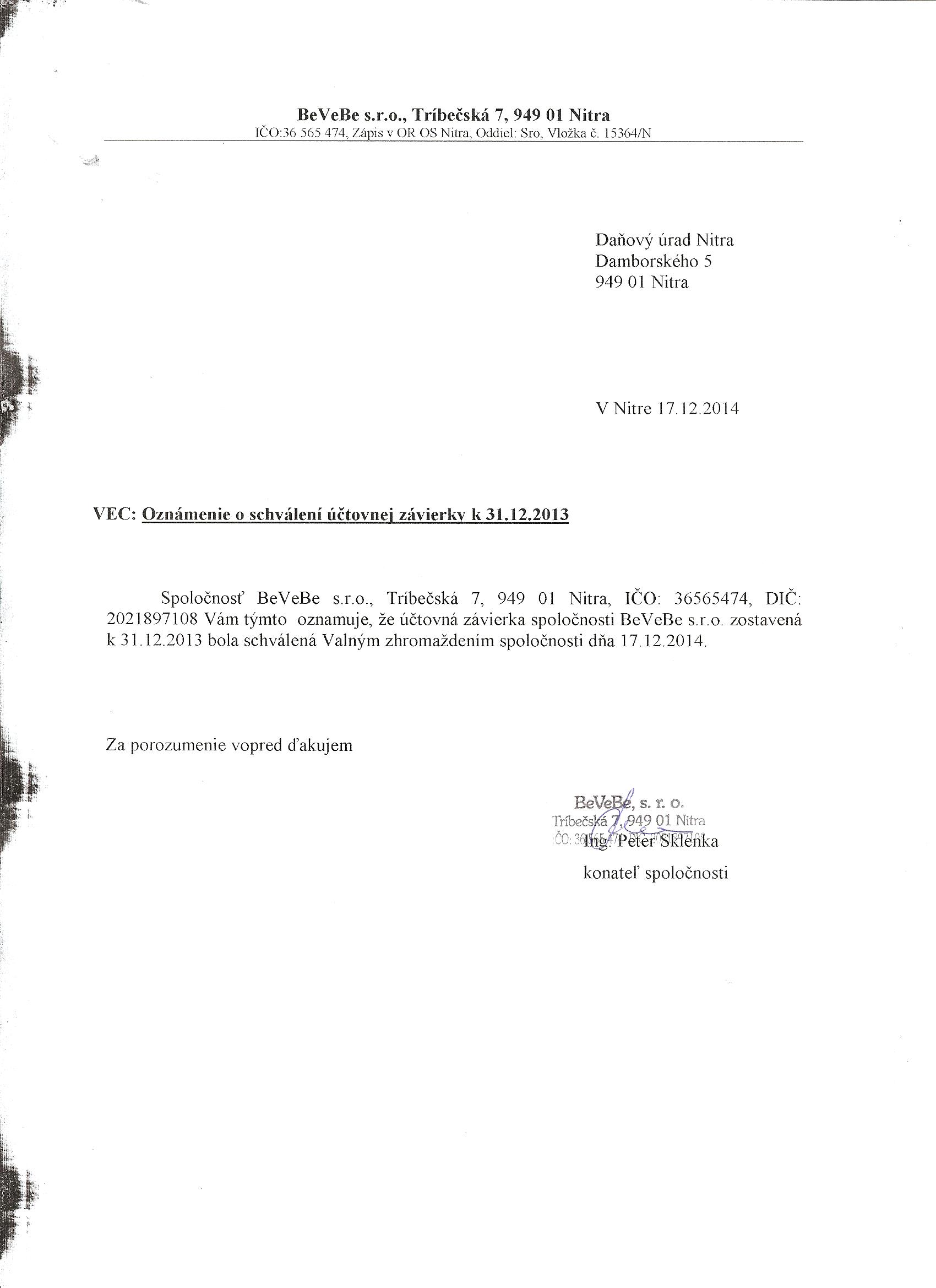 Oznámenie o schválení účtovnej závierky
