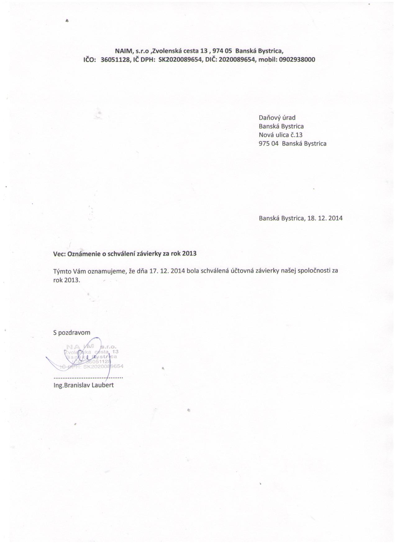 Oznámenie o schválení účtovnej závierky