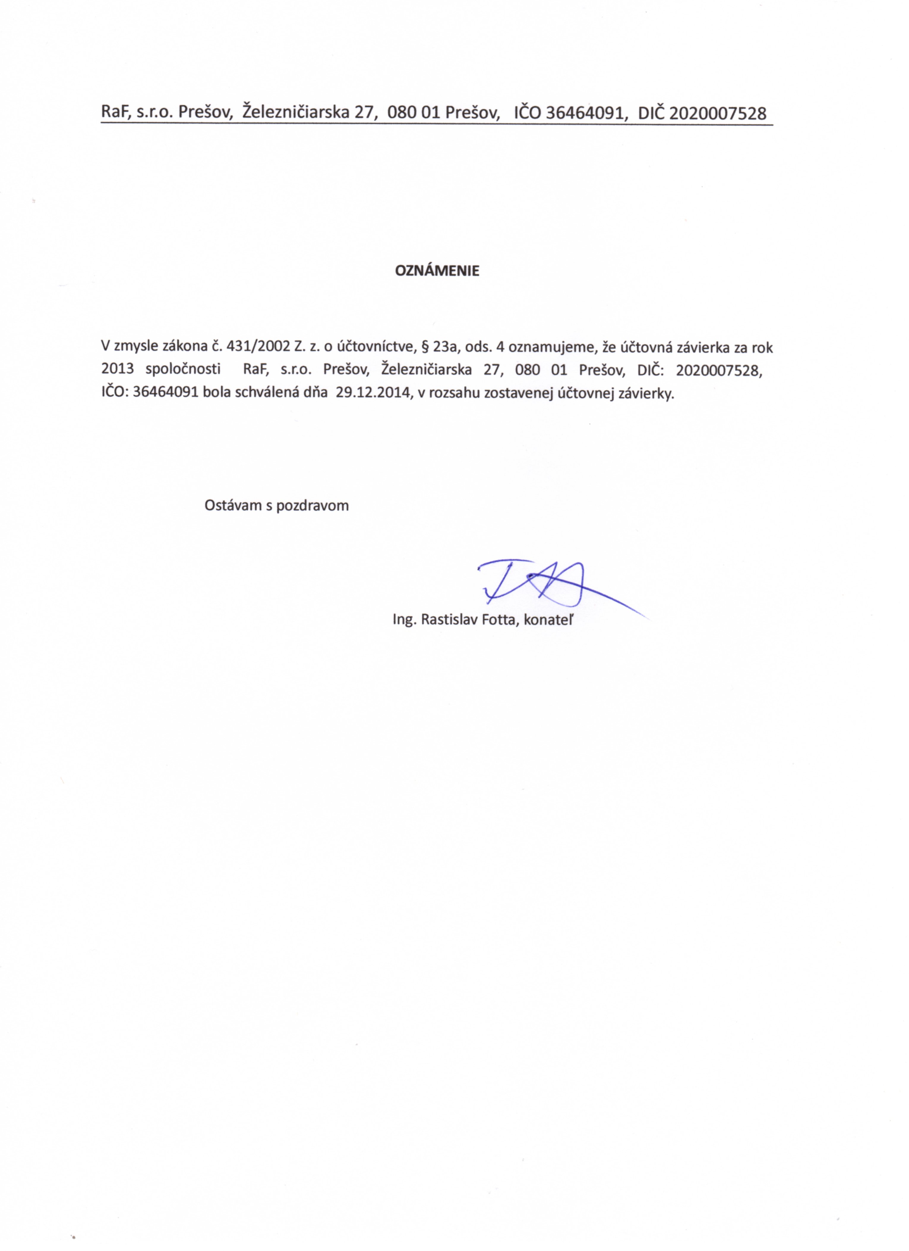 Oznámenie o schválení účtovnej závierky