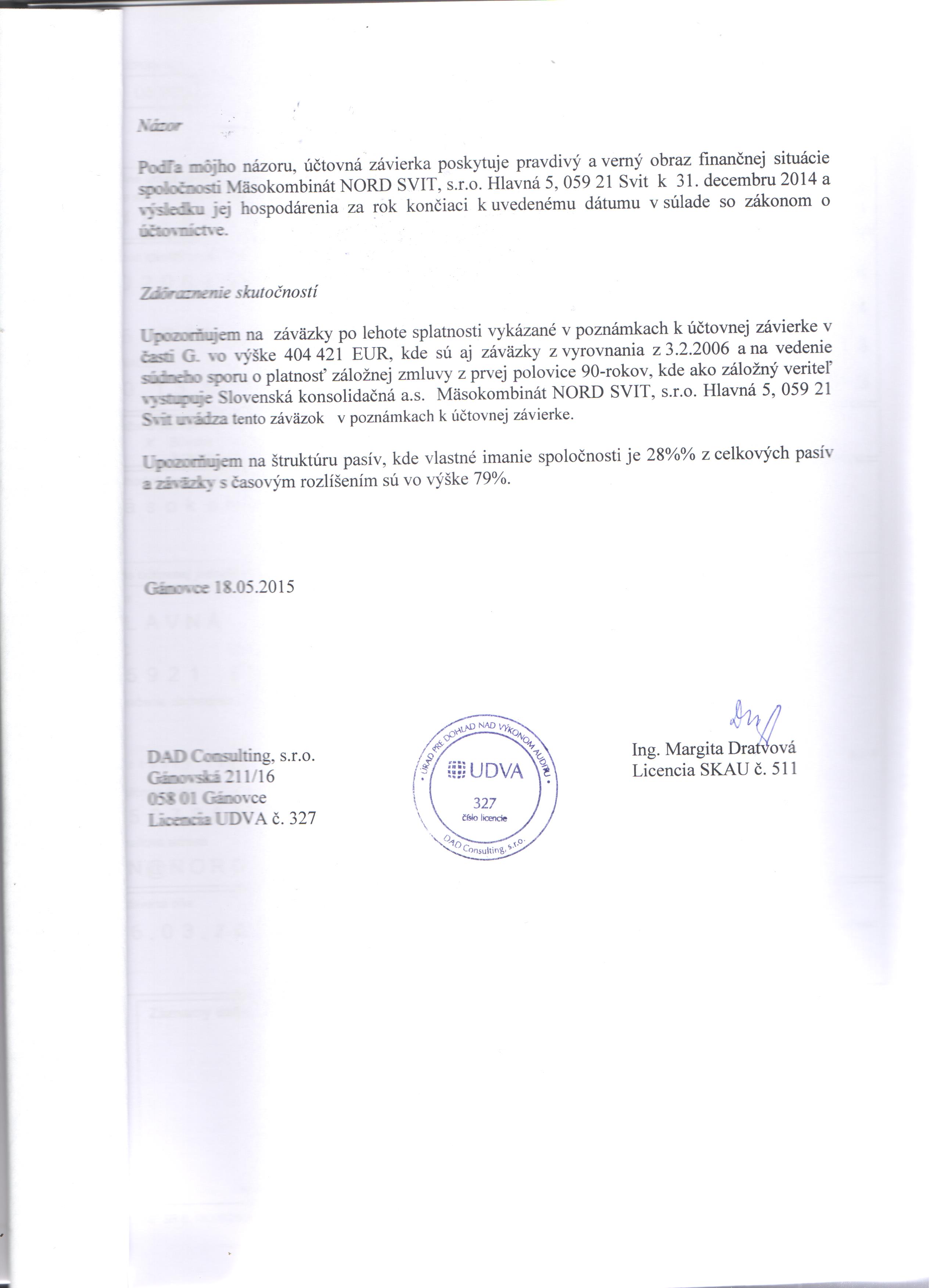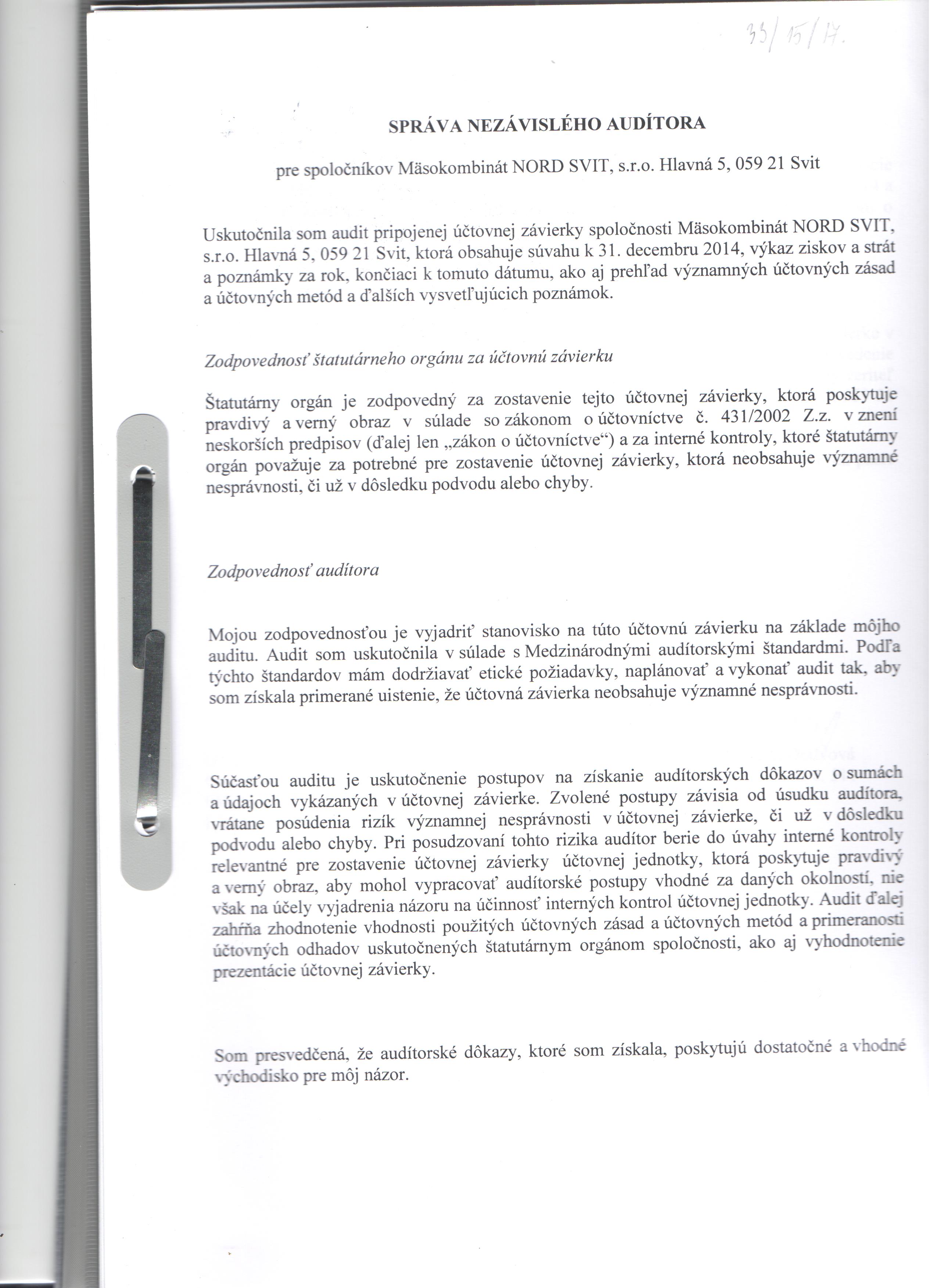 Správa audítora k 31.12.2014